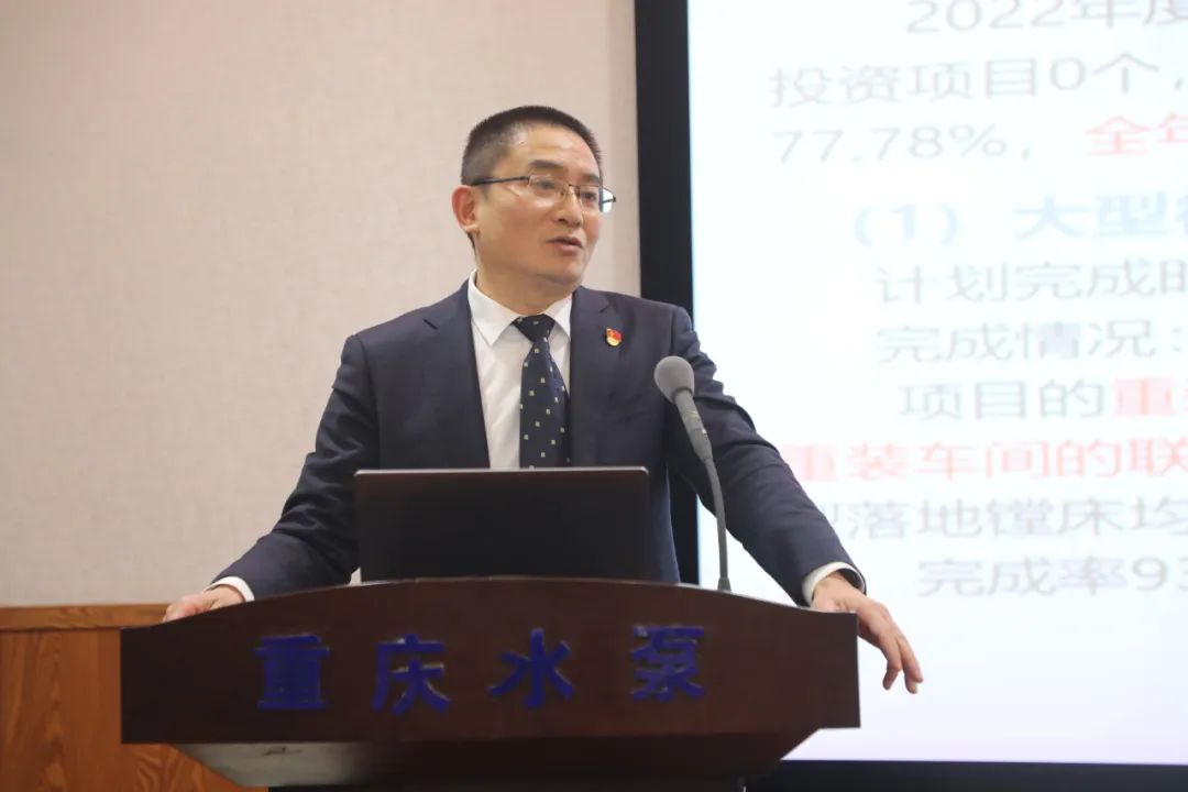 公司黨委副書記、紀委書記、工會主席李衛作了《深學黨的二十大精神,全面從嚴治黨,奮力書寫重泵公司高質量發展新篇章》的黨委工作報告,副總經理潘志敏作了市場和質量工作報告,副總經理何智奎作了生產運行報告,財務副總監劉佳玲作了財務工作報告,總工程師馬文生作了技術創新工作報告,副總工程師冉宏民、白小榜也分別就分管工作作了專題報告,黨委副書記、總經理張波作了講話。